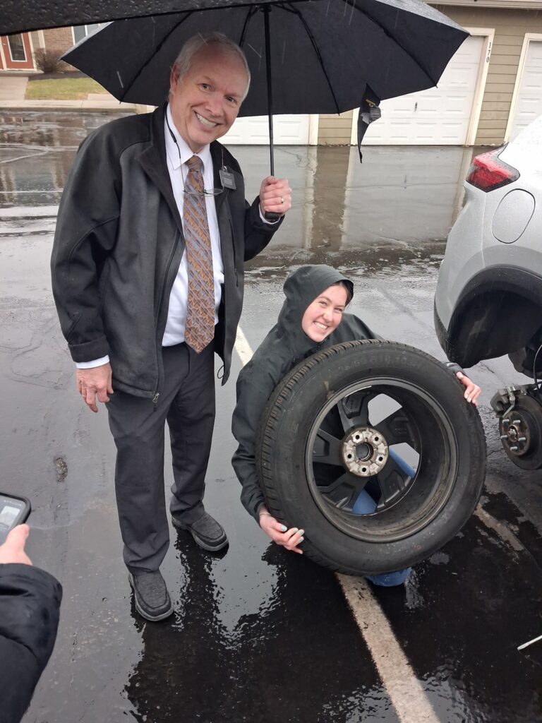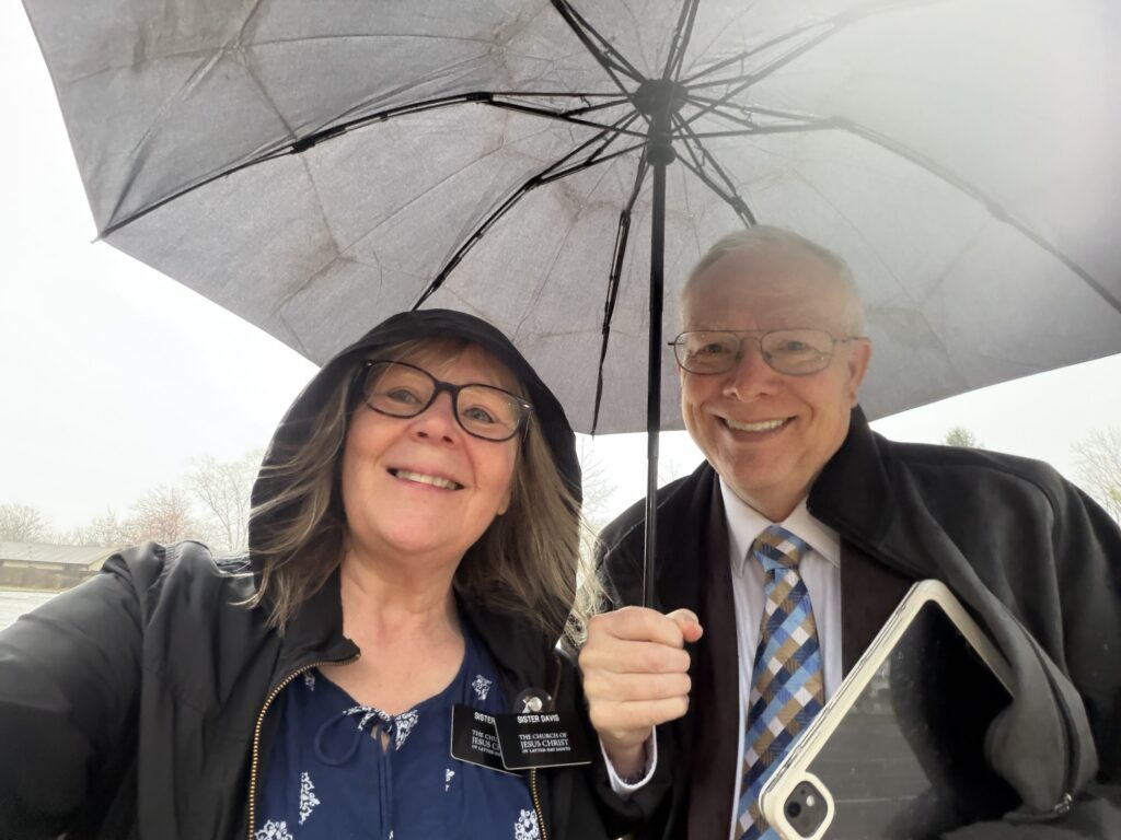 When he got there one of the sisters said she wanted to learn so Elder Davis held the umbrella while she changed it! Mission accomplished!